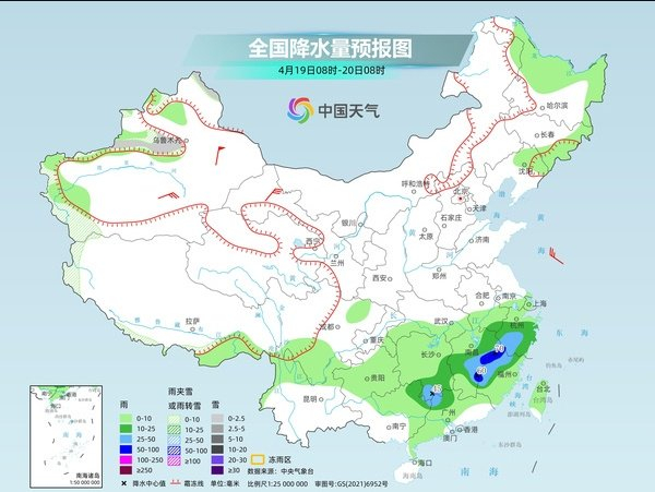 明天,新疆沿天山地区和南疆盆地、西藏南部和西部等地部分地区有小雪或雨夹雪。江南中东部和南部、广西东北部、广东西北部等地部分地区有中到大雨,其中,江西中南部、福建西北部等地部分地区有暴雨。