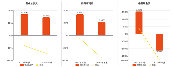 公司营业总收入为19.39亿元,较去年同报告期营业总收入减少3.28亿元,同比较去年同期下降14.48%。归母净利润为2.43亿元,较去年同报告期归母净利润减少1.39亿元,同比较去年同期下降36.41%。经营活动现金净流入为-2.97亿元,较去年同报告期经营活动现金净流入减少6.90亿元,同比较去年同期下降175.51%。