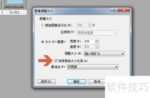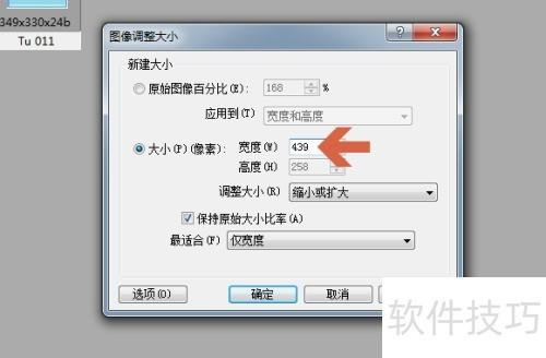 5、 在调整大小界面选择大小(像素)选项,于宽度框输入数值,该数值可依据原始图片尺寸设定,例如本例中某图片宽度为439。