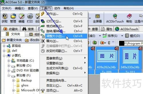 4、 在ACDSee5.0工具菜单里,点击调整大小选项。
