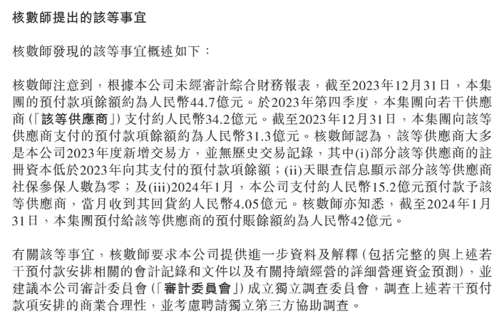 核数师还表示,2024年1月,洪九果品支付约15.2亿元预付款给上述该等供应商,当月收到其回货约4.50亿元。核数师也知悉,截至2024年1月31日,洪九果品预付给该等供应商的预付账余额约为42亿元。