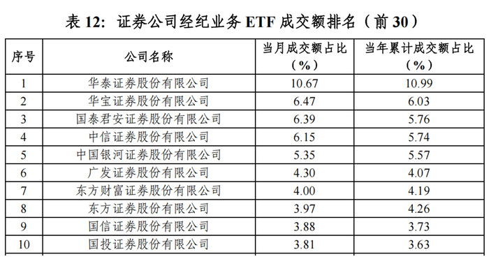 ETF交易账户数量是衡量券商客户活跃度的重要指标,华泰证券以11.39%(2月)和11.12%(3月)的累计占比稳居第一,其“涨乐财富通”APP的定投功能优化持续吸引个人投资者。