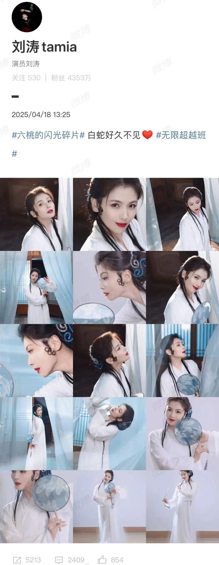 随后,刘涛在个人社交媒体晒出15张“白素贞”美照,并配文称:“白蛇好久不见。”