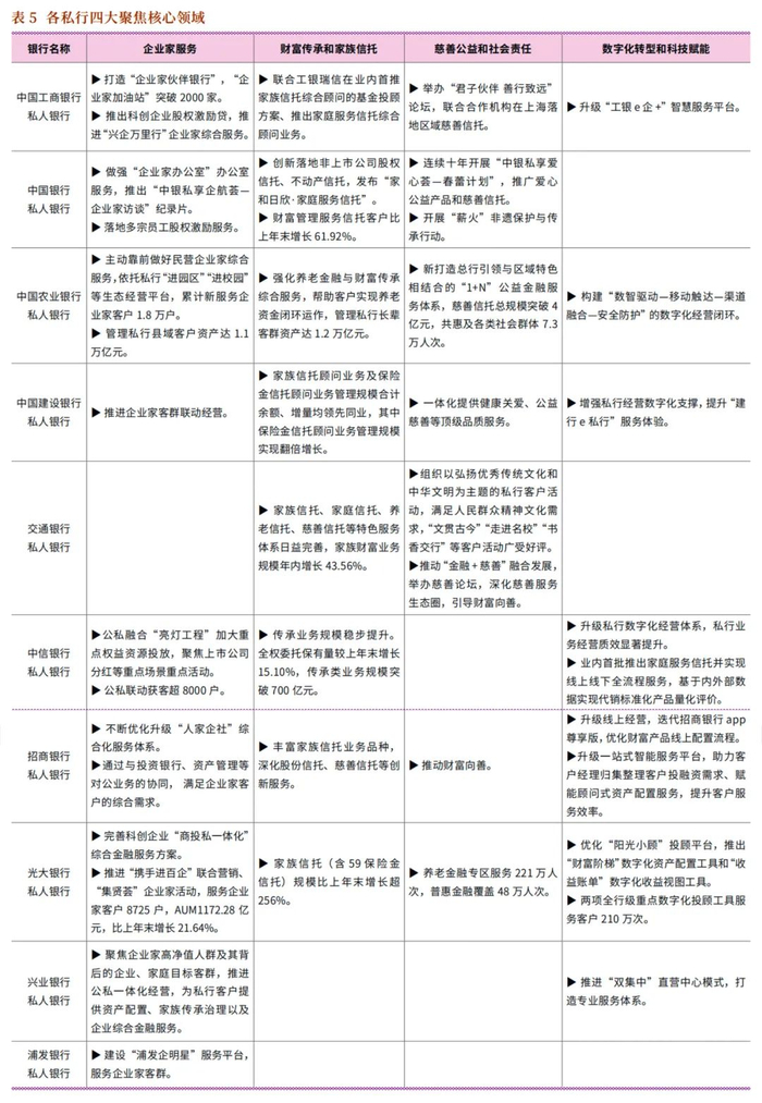 2024年,各私行聚焦于企业家服务、财富传承和家族信托、数字化转型与科技赋能、社会责任与慈善公益四大核心领域(如表5),以提升对客户的资产配置服务能力。国有大行私人银行与股份制银行私行在这些领域的策略各有侧重,呈现出不同的发展路径。