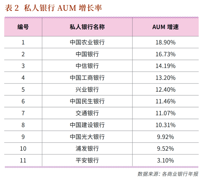 此外,从AUM排名和AUM增速排名来看,国有五大行私人银行中的三家(中国工商银行私人银行、中国农业银行私人银行、中国银行私人银行)占据前四名中的三席,显示出国有大行在私人银行领域的持续竞争力。