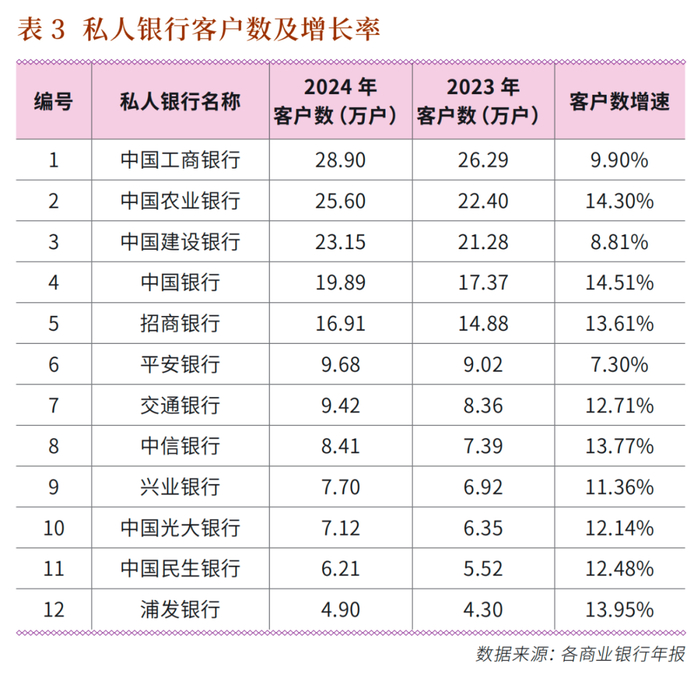 中国银行私人银行虽增速亮眼(16.73%),但受制于高门槛(800万元),客户基数较小,被农行反超,从第二名降为第三名。