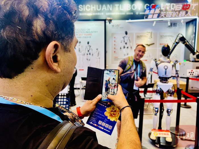 当日上午10时15分,这个服务机器人专区里,记者来到四川天链机器人股份有限公司的展台前,发现热闹的氛围在这里尤为突出——展台最前面,摆放着公司的人形机器人产品,前来与机器人“打卡”合影的人没间断过。