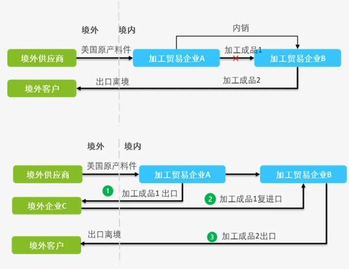 在此轮对美加征的场景下,对于美国原产料件,区外加工企业B仍可在保税状态下进口料件加工为成品,但成品禁止保税流转至海关特殊监管区域。