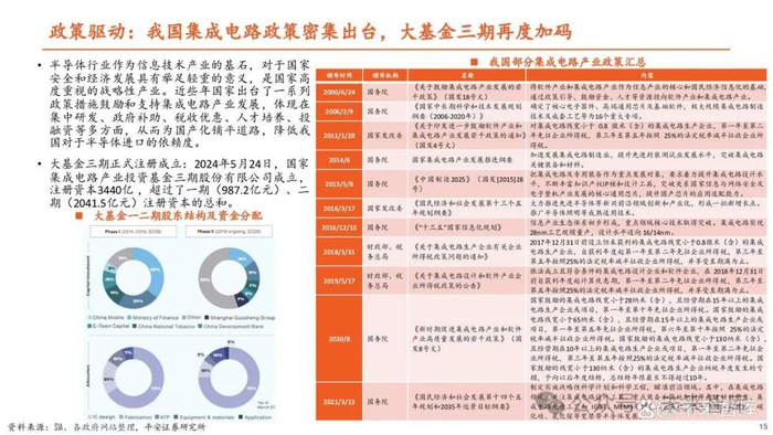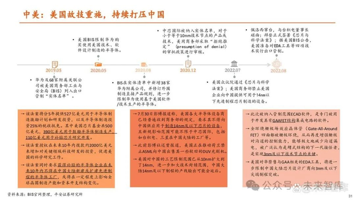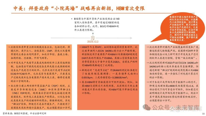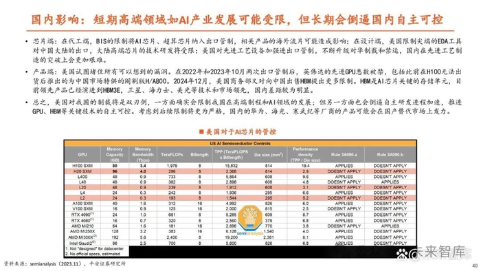 芯片端:在代工端,BIS的限制将AI芯片、超算芯片纳入出口管制,相关产品的海外流片可能造成影响;在设计端,美国限制尖端的EDA工具 对中国大陆的出口,大陆高端芯片的技术研发将受限;美国对先进工艺设备加强进出口管制,不断升级对华制裁和禁运,国内在先进工艺制 造的突破上会更加艰难。产品端:美国试图堵住所有可以想到的漏洞。在2022年和2023年10月两次出口管制后,英伟达的先进GPU悉数被禁,包括此前在H100无法出 货后推出的为中国市场特供的阉割版H/A800。2024年12月,美国商务部又对向中国出售HBM提出更多限制。HBM是AI芯片关键的存储单元,目 前领先产品已经演进到HBM3E,三星、海力士、美光等技术和市场领先,国内差距较为明显。总之,美国对我国的制裁将是双刃剑,一方面确实会限制我国在高端制程和AI领域的发展; 但另一方面也会倒逼自主研发进程加速,推进 GPU、HBM等关键技术的自主可控。考虑到后续限制将更为严格,国内的华为、海光、寒武纪等厂商的产品可能会在国产替代市场上发力。