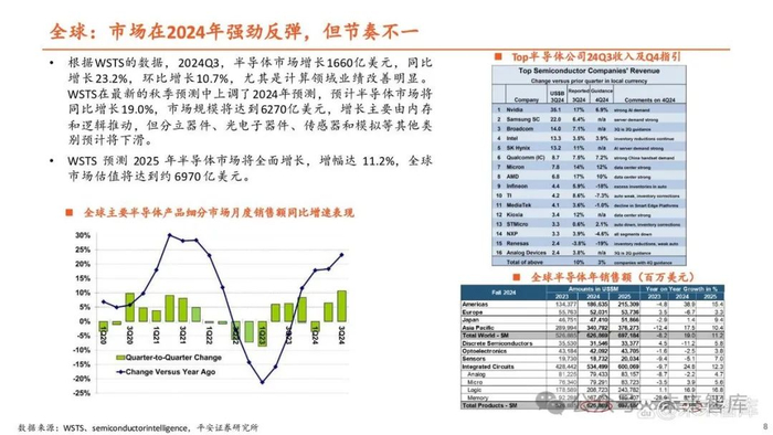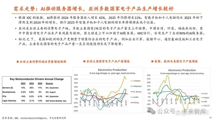 根据 IDC 的数据,AI将推动 2024 年服务器收入增长 42%,2025 年仍将增长11%。智能手机和个人电脑均从 2023 年的下 滑恢复到 2024年的增长,预计 2025年智能手机和个人电脑的增长率将保持在低个位数。 亚洲是全球主要的消费电子产地,多数主要国家/地区的电子产品产量呈上升趋势,中国台湾、印度、越南在向好,其 中中国台湾电子产品生产表现最为强劲,很大程度上可以归因于AI服务器。MIC估计,台湾生产了全球90%的AI服务器。 相比之下,美国和欧洲的生产更侧重于销售给企业的电子产品,例如企业计算、数据中心、通信基础设施和工业电子 产品,主要发达国家的电子产品产量一直呈现缓慢增长或下降趋势。