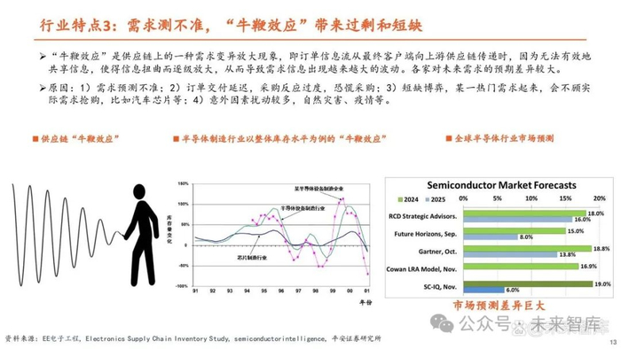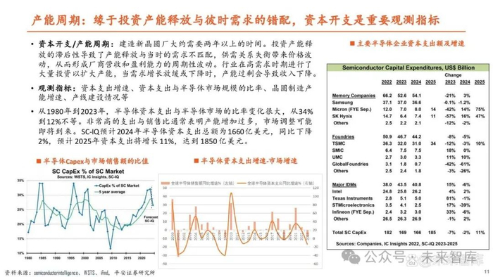 存储芯片:具备大宗商品特性,容量是核心指标,价格敏感,受市场供 需情况波动,属于标准化产品,产品可替代性强,加上当前行业已形成 垄断格局,头部厂商在产能和定价方面调整步调相对一致,因此行业弹 性更大。在2017年半导体上行周期中,存储芯片同比增速突破60%,大 幅领先其他细分领域,而2019年周期向下时,跌幅也明显更大。波动巨大:1)供给端逆市操作;2)需求端波动;3)市场炒作 。存储芯片与集成电路整体周期呈现强关联关系,且周期性强于其他半导 体细分行业,往往遵循3-4年一个周期循环。供需关系波动背后其实由 资本开支周期主导。