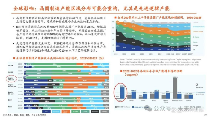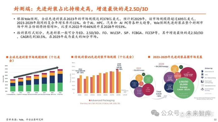 封测处于半导体产业链的中后端,主要作用为对芯片进行封装、测试与检测,属于资本密集型、劳动密集型,直接对 接下游终端,因此下游应用变化和需求变化直接影响封测行业的技术路线和稼动率。 2022年全球OSAT排名来看,日月光和安靠分别位列一、二,其中前十名中有3家中国大陆企业——长电科技、通富微 电和华天科技。2022年,中国大陆和中国台湾共拥有全球近60%的ATP产能。东南亚也已是ATP重镇,占全球总产能的 约20%。BCG预计东南亚将推动新兴市场的ATP产能在2032年达到27%。 先进封装技术应运而生:后摩尔时代,随着集成电路工艺制程的越发先进,对技术端和成本端均提出了更大挑战。先 进封装能在不单纯依靠芯片制程工艺实现突破的情况下,通过WLP、SIP,提高产品集成度和功能多样化,满足终端应 用对芯片轻薄、低功耗、高性能的需求,同时大幅降低芯片成本。