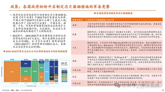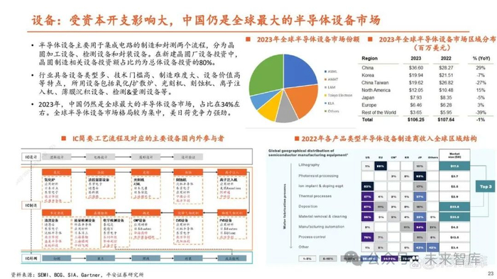 晶圆代工技术迭代快,市场呈现一超多强:对于半导体制造商来说,资本支出对于维持其竞争地位非常重要。晶圆 代工产业创新的步伐迅速,需要大量资本支出才能继续生产更先进的器件。晶圆代工是典型的寡头垄断型行业,TOP10 竞争格局也较稳定。2024Q3 , 全球市场前十的晶圆代工市占率高达96% 。 全球晶圆代工市场份额绝大部分被我国台湾 地区所占据,台积电以64.9%的市场占有率一马当先。中国大陆晶圆代工行业起步晚,但在芯片设计市场需求、国家政策支持、资本投入等因素共同作用下, 近几年 实现 了快速发展,中芯国际、华虹和合肥晶合位居前十。根据SIA,2022年中国大陆的晶圆制造产值占比最高,达到24%。