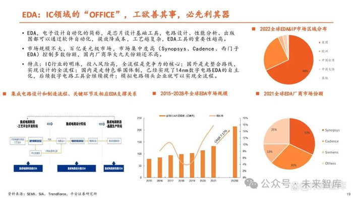EDA,电子设计自动化的简称,是芯片设计基础工具,电路设计、性能分析、出版 图都可以通过软件自动化,提效降成本,工艺越复杂,EDA工具的重要性越高。 市场规模不大,百亿美元级市场,市场集中度高(Synopsys、Cadence、西门子 EDA)控制多数份额,国内厂商华大九天份额还不高。特点:IC行业的明珠,投入风险高,全流程是竞争力的核心;国外是走整合路线, 实现设计的全流程;国内是走特色举国体制,已经实现了14nm数字电路EDA的自主 化,后续数字电路工具会继续提升;模拟电路领头企业就可以实现全流程。