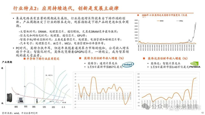 摩尔定律:1965年由英特尔创始人之一戈登·摩尔提出,即集成电路上可容纳的晶体管数目,约每隔18-24个月会增加1倍, 性能也将提升一倍。特征尺寸持续缩小,晶体管集成度呈现出指数化增长,要求芯片设计、制造厂商的产品更小、更快 和更便宜。摩尔定律带来的“理性”选择,如果过18个月,同样的价格可以性能翻倍的产品,很多客户可能选择延迟消费。而事实 上,ICT产业持续保持增长,半导体尤其是集成电路的需求持续稳定攀升。 “安迪-比尔定律”——系统和应用将拉动需求:“Andy gives, Bill takes away.”该定律是对硬件与软件升级之间关系的陈 述,是指新软体总将耗尽新硬体所提高的任何计算能力。直观的感觉是,硬件提升水平明显,但是软件的运行速度并没 有大幅度提升。