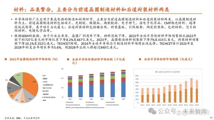 根据SEMI的数据,由于行业去库存,晶圆厂利用率下降,材料消耗下降,2023年全球半导体材料市场销售额从2022年 创下的727亿美元的市场纪录下降8.2%至667亿美元。2023年,晶圆制造材料销售额下降7%至415亿美元,封装材料销售 额下降10.1%至252亿美元。TECHCET预测,2024年全球半导体芯片制造材料市场将出现反弹。TECHCET预计2023年至 2028年的复合年增长率为5.6%,到2028年总收入将超过840亿美元。