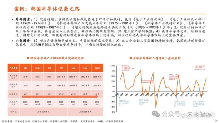 外部因素:1)政府持续出台相关法案和政策措施予以保护和扶持,包括《电子工业振兴法》、《电子工业振兴八年计 划(1969~1976年)》、《推动半导体产业发展六年计划(1975~1981年)》、《半导体工业扶持计划》、《半导体工 业振兴计划(1983~1987年)》、《超大规模集成电路技术共同开发计划(1986~1993年)》等;2)政府扶持和保护 本土半导体企业,将资金注入巨头企业,分担高比例研发费用;3)建立官产学研联盟;4)美日半导体之争,给韩国创 造了相对良好的环境,即使美韩后续也在半导体领域出现争端,韩国政府也成为半导体市场上的重要力量。内部因素:1)顺应存储市场更低成本、更普适性的需求变化;2)龙头企业如三星集团的持续坚持,韩国成功的逆势扩 张策略,在DRAM等领域击垮大量竞争对手,并确立持续的领先地位。