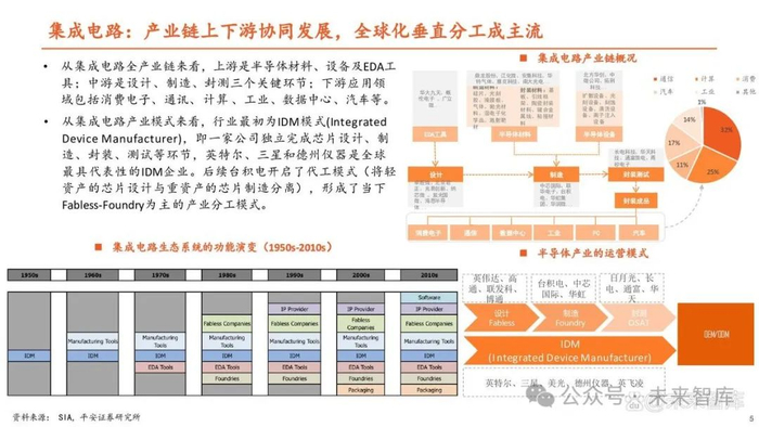 从集成电路全产业链来看,上游是半导体材料、设备及EDA工 具;中游是设计、制造、封测三个关键环节;下游应用领 域包括消费电子、通讯、计算 、工业、数据中心、汽车等。从集成电路产业模式来看,行业最初为IDM模式(Integrated Device Manufacturer),即一家公司独立完成芯片设计、制 造、封装、测试等环节,英特尔、三星和德州仪器是全球 最具代表性的IDM企业。后续台积电开启了代工模式(将轻 资产的芯片设计与重资产的芯片制造分离),形成了当下 Fabless-Foundry为主的产业分工模式。