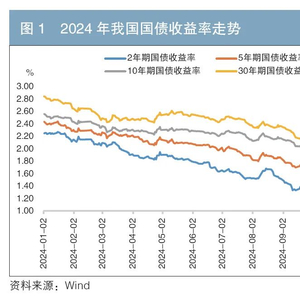 2024年末,2年、5年、10年、30年期国债收益率分别为1.14%、1.42%、1.68%、1.91%,较年初分别下行111BP、102BP、88BP、93BP。2024年国债收益率走势大致可以划分为以下4个阶段(见图1)。