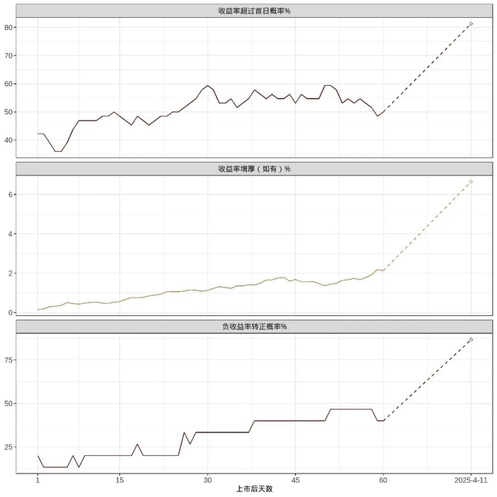 通过小幅延长持有时间来增厚打新收益率有难度,真长期持有更为有效。我们统计64单项目打新,上市后第2-60个交易日全部卖出时的收益率,高于首日全部卖出策略收益率的概率较难超过60%,且高于首日的项目平均收益率增厚较难超过2%。首日负收益时能够在60个交易日内转正的概率也不足50%。积极的一面是,若长期持有,比如我们统计若64单项目均长期持有至2025年4月11日,收益率增厚概率、首日负收益的项目投资回报率转正的概率均提升至80%以上,平均收益率增厚幅度也有所增加。