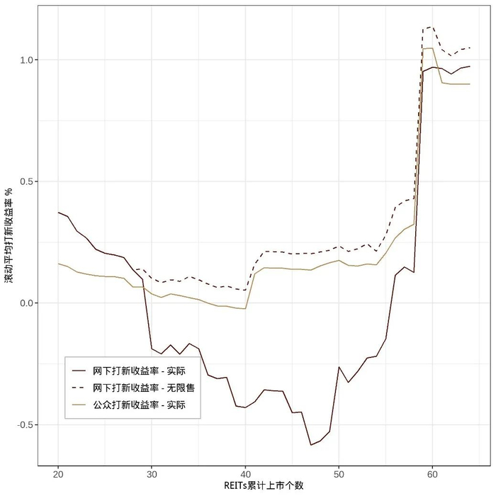 特别的,自中金山东高速REIT上市至汇添富九州通医药REIT上市,网下打新获配份额均存在上市初3个交易日内可交易份额不超过20%的限制,假设这些REITs的网下打新获配份额均为上市首日卖出20%,上市第t(t>3)日卖出剩余的80%,则其扣除资金成本前的网下打新回报率为20%x(获配部分上市首日涨幅)+20%x(获配部分首日卖出后至交易日t-1(含)的资金回报率)+80%x(获配部分交易日t卖出时的相对发行价涨幅)+拟认购但未获配部分自退款日至t-1交易日(含)的资金回报率。公众发售获配份额无限售期,故公众发售打新收益率计算方式不变。
