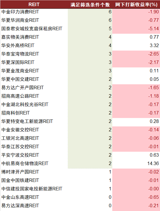 我们认为可通过因子阈值定量筛选与主观判断相结合,建立网下打新择券策略。我们将定量筛选应规避项目的条件暂定为图表13。满足2个或以上筛选条件的项目有19个,其中12个为网下打新收益率为负的项目,且涵盖了全部网下打新收益率小于等于-1%的项目。通过主观、经验进一步优化择券策略的方向包括但不限于1)对满足2-4个筛选条件的项目,根据对新资产类型的偏好、兜底条款情况、资产评估参数情况、市场分歧情况等主观调整决策;2)根据市场环境变化对筛选阈值进行调整;3)因子计算方式的优化。