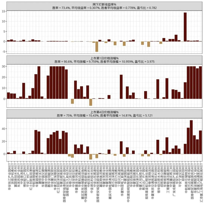 网下打新后上市初期即(按限售条款)卖出的胜率为73.4%,平均收益率(剔除资金成本,下同)0.307%,但盈亏比低于1。截至2025年4月11日,共计64单REITs首发上市,网下打新的胜率为73.4%,盈亏比仅为0.782,平均收益率为0.307%,胜者(打新收益率为正的项目)平均收益率为0.778%。