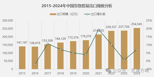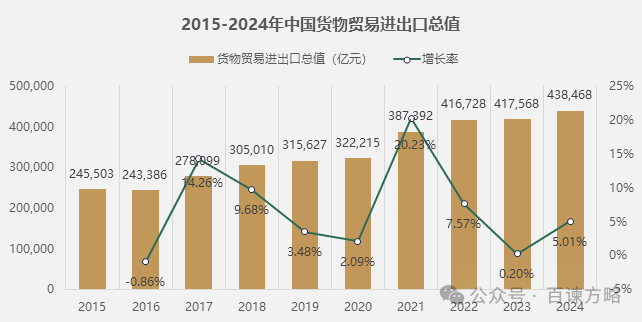 根据海关总署数据统计,2024年,我国有进出口记录的经营主体近70万家,全年进出口总值达到43.85万亿元人民币,同比增长5.01%,规模再创历史新高;过去10年中,中国坚持改革开放,已成为150多个国家和地区的主要贸易伙伴,贸易总值同比2015年增长1.79倍,10年平均均复合年增长率(CAGR)达到6.66%。