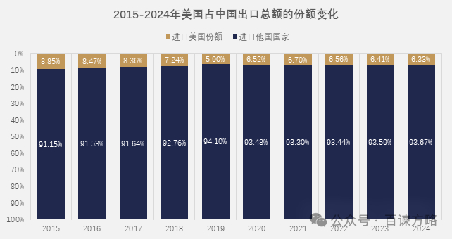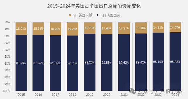 从出口占比上看,2015年,美国占中国出口总额18.01%,到2024年已下降至14.67%;美国占中国出口比例的下降,反映了全球贸易格局重构、出口市场多元化、中美博弈升级以及中国经济转型的深层变革。