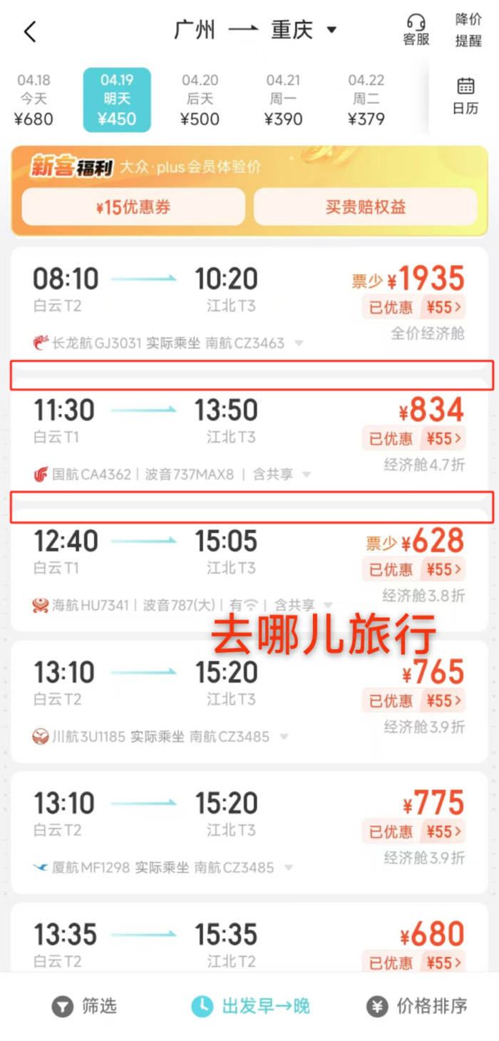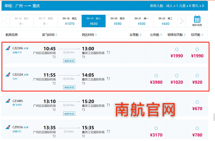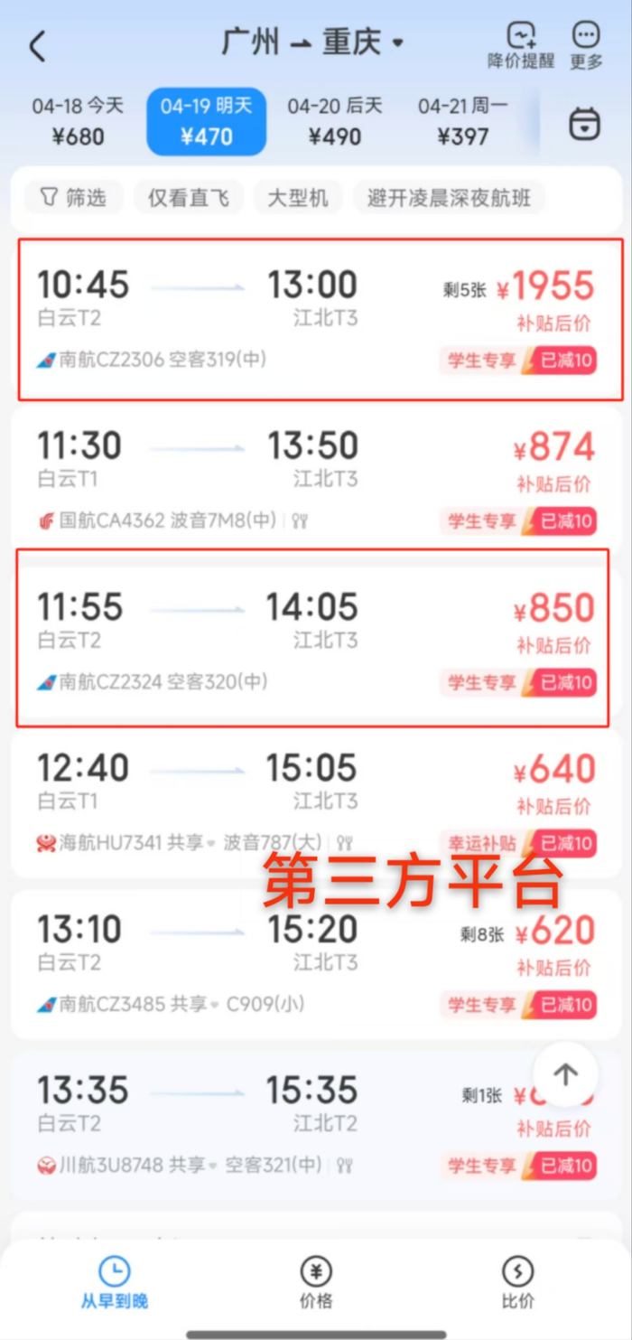 具体来看,例如搜索4月19日“广州飞重庆”的早上航班,在南航官网有10:45起飞至13:00落地的、11:55起飞至14:05落地的,从广州白云国际机场到重庆江北国际机场的航班;在第三方购票平台同样可以搜索到上述这两班飞机,分别为南航CZ2306和南航CZ2324。但是在去哪儿旅行APP上,同样时间段内,这两班飞机并未显示。