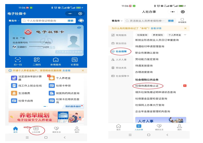 ②登录本人电子社保卡,在首页“人社办事”里,找到“社会保障”,点击“社保待遇资格认证”,按提示操作,进行人脸识别后,完成认证。