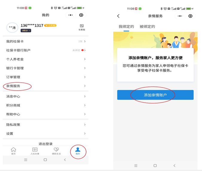 如果待遇领取人员不会使用手机操作,可由子女登录自己的电子社保卡,点击“我的”,进入“亲情服务”模块,按提示绑定父母的电子社保卡,协助父母完成人脸识别认证。