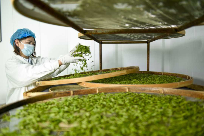 4月17日,河北省石家庄市灵寿县南营乡漫山村展翼茶叶专业合作社的制茶师在晾晒茶叶。白云飞摄.