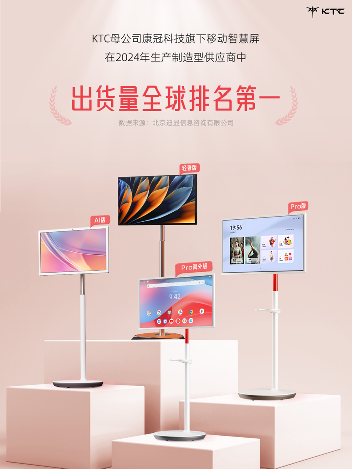 市场成绩的背后离不开KTC母公司康冠科技身后的智能制作实力,根据市场权威咨询调查机构北京迪显信息咨询有限公司发布的数据,2024 年KTC母公司康冠科技生产的移动智慧屏在生产制造型供应商中的出货量全球排名第一。  KTC闺蜜机旗下有多款机型,以差异化的技术满足用户多元化需求。