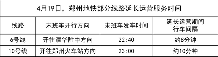 4月19日,郑州奥林匹克体育中心将举行大型活动,郑州地铁部分线路延长运营服务时间。
