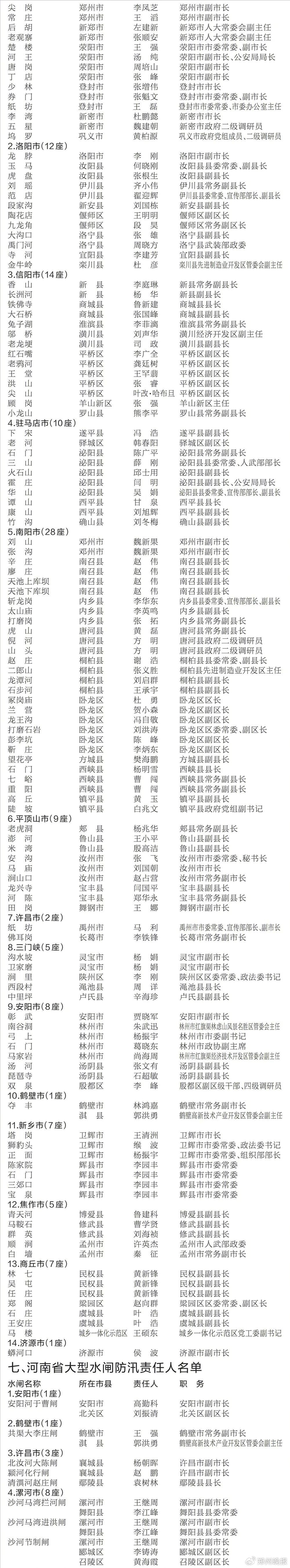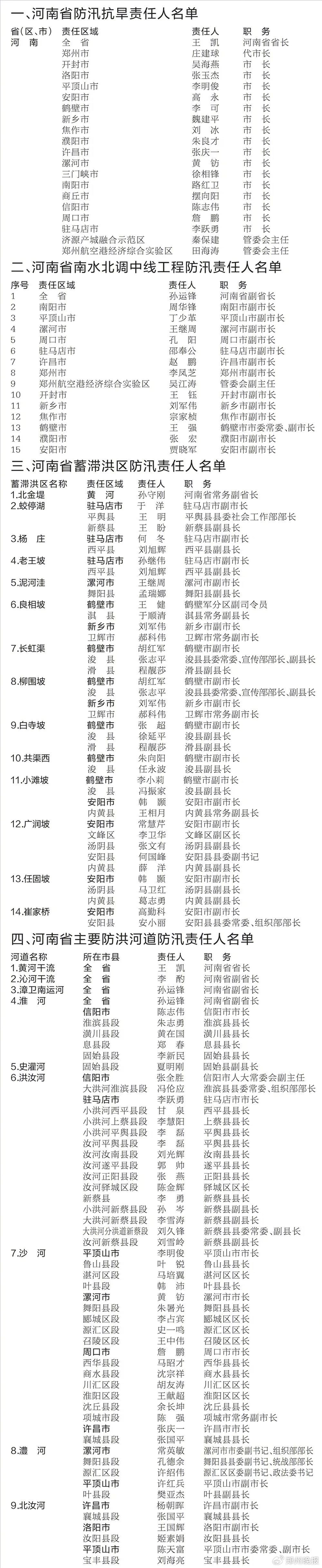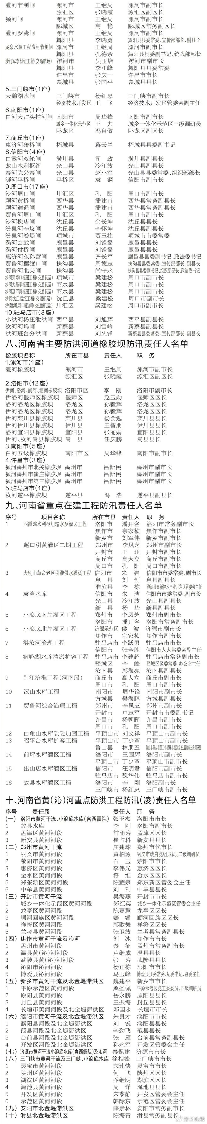 为全面落实防汛抗旱工作责任,扎实做好2025年防汛抗旱工作,经省政府同意,现将全省防汛抗旱责任人,南水北调中线工程、蓄滞洪区、主要防洪河道、大中型水库、大型水闸、主要防洪河道橡胶坝、重点在建工程和黄(沁)河重点防洪工程防汛(凌)责任人名单予以通告。
