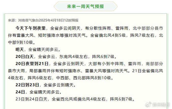 据河南气象消息,今天下午到夜里,全省分散性阵雨、雷阵雨“登场”,北中部部分县市伴有雷暴大风、短时强降水等强对流天气。全省风力较大,4到5级偏北风,阵风7级左右,北中部阵风可达9到10级。