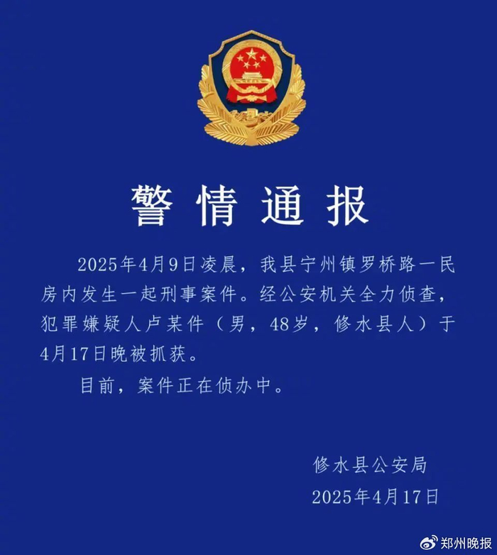 近日,修水一民房发生刑案致2人死亡,嫌疑人卢某犯案后潜逃。4月17日,江西修水县公安局通报:犯罪嫌疑人卢某已被抓获。目前,案件正在侦办中。