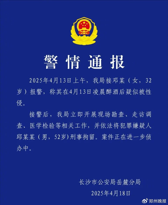4月18日,长沙市公安局岳麓分局发布警情通报,4月13日上午接邓某(女,32岁)报警,称其在4月13日凌晨醉酒后疑似被性侵。警方接警后开展相关工作,依法将犯罪嫌疑人邱某某(男,52岁)刑事拘留。