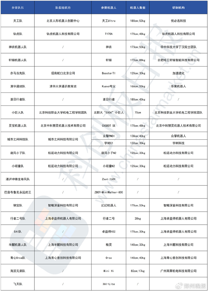 4月19日,全球首个人形机器人半程马拉松将在北京亦庄鸣枪开跑。今日,全球首场人形机器人半程马拉松公布了参赛选手名单:
