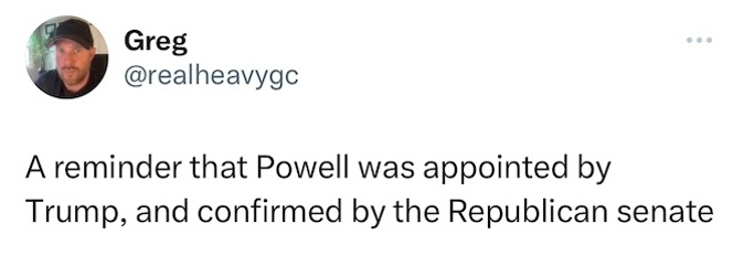 “提醒一下,鲍威尔(最早)是由特朗普任命、经国会参议院表决批准上任的。”↓