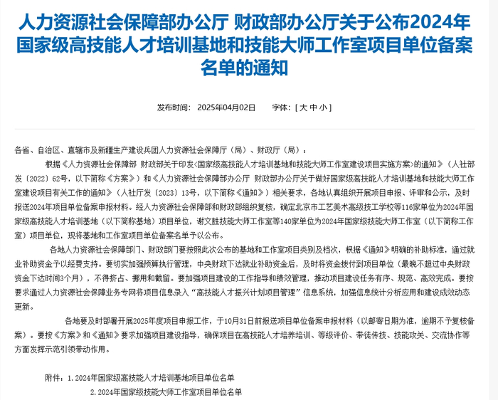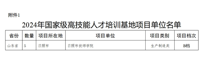 近日,人力资源社会保障部办公厅、财政部办公厅公布了2024年国家级高技能人才培训基地和技能大师工作室项目单位备案名单,日照市技师学院生产制造类项目作为山东省五个项目之一成功获评2024年国家级高技能人才培训基地建设项目。