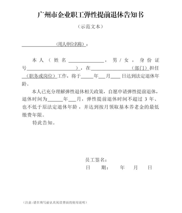 近日,广州市人力资源和社会保障局官网发布《关于印发企业职工弹性退休相关文书的通知》,(以下简称《通知》),提供给用人单位和劳动者参考使用。今后,国家和省如出台新的规定,从其规定。