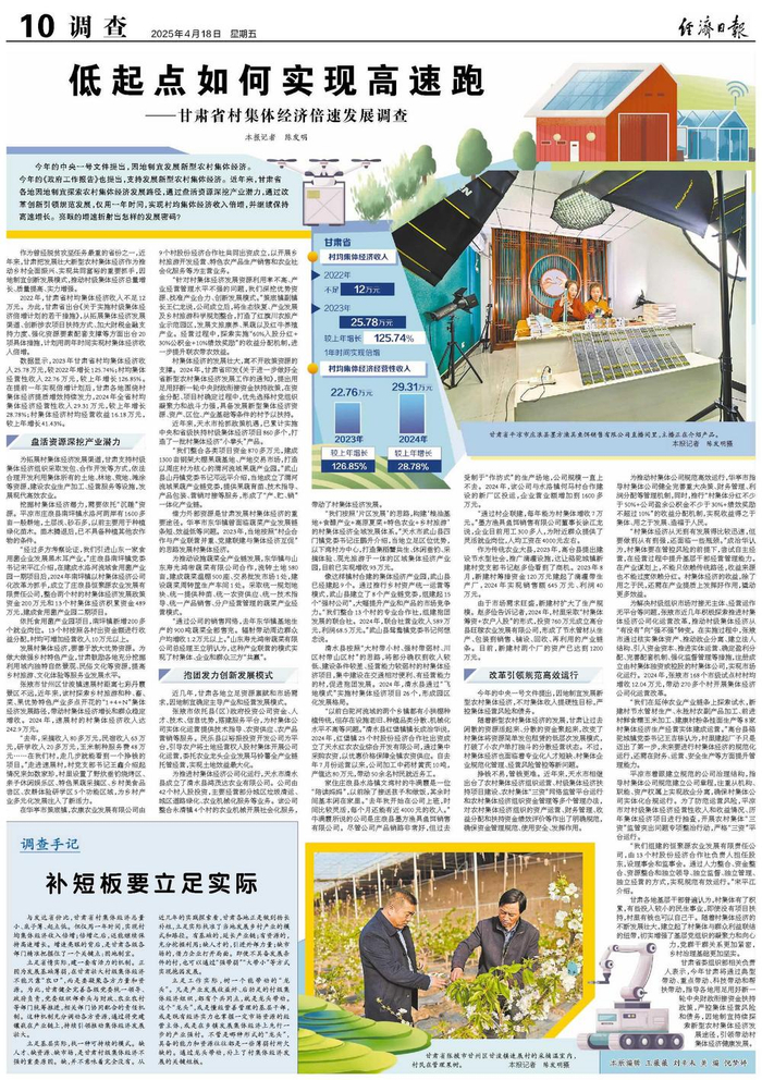 今年的中央一号文件提出,因地制宜发展新型农村集体经济。今年的《政府工作报告》也提出,支持发展新型农村集体经济。近年来,甘肃省各地因地制宜探索农村集体经济发展路径,通过盘活资源深挖产业潜力,通过改革创新引领规范发展,仅用一年时间,实现村均集体经济收入倍增,并继续保持高速增长。亮眼的增速折射出怎样的发展密码?