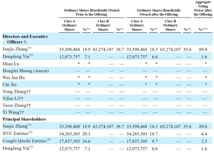 IPO后,张俊杰持有18.3%的A类股,及35.6%的B类股,有89%的投票权;Dengfeng Yin持有6.6%的A类股,有1.6%的投票权;
