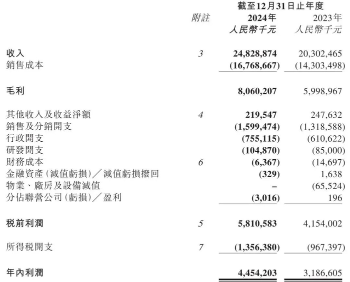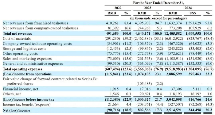 霸王茶姬2022年、2023年、2024年净利分别为-9072万元、8亿元、25.15亿元(约3.45亿美元);净利率分别为-18.5%、17.3%、20.3%。