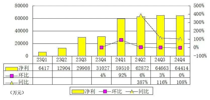 霸王茶姬2024年第四季度净利为6.44亿元,较上年同期的3.1亿元增长108%,较上一季度的6.46亿元基本持平。