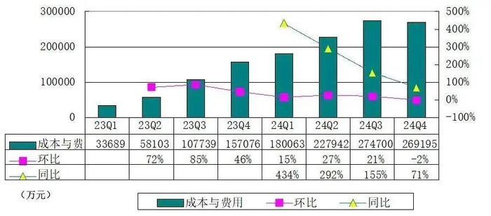 霸王茶姬2024年第四季度成本与费用为26.92亿元,较上年同期的15.7亿元增长71%。