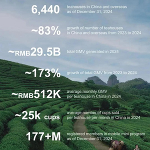 截至2024年12月31日,霸王茶姬共有6440家门店,其中,6284家位于中国。霸王茶姬2024年GMV为295亿元,2023年的GMV为108亿元。