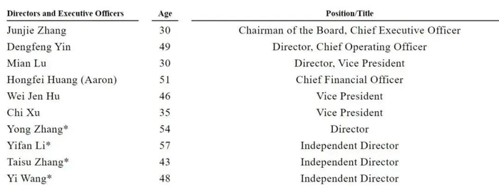 CFO为Hongfei Huang (Aaron),Wei Jen Hu、Chi Xu分别为副总裁。